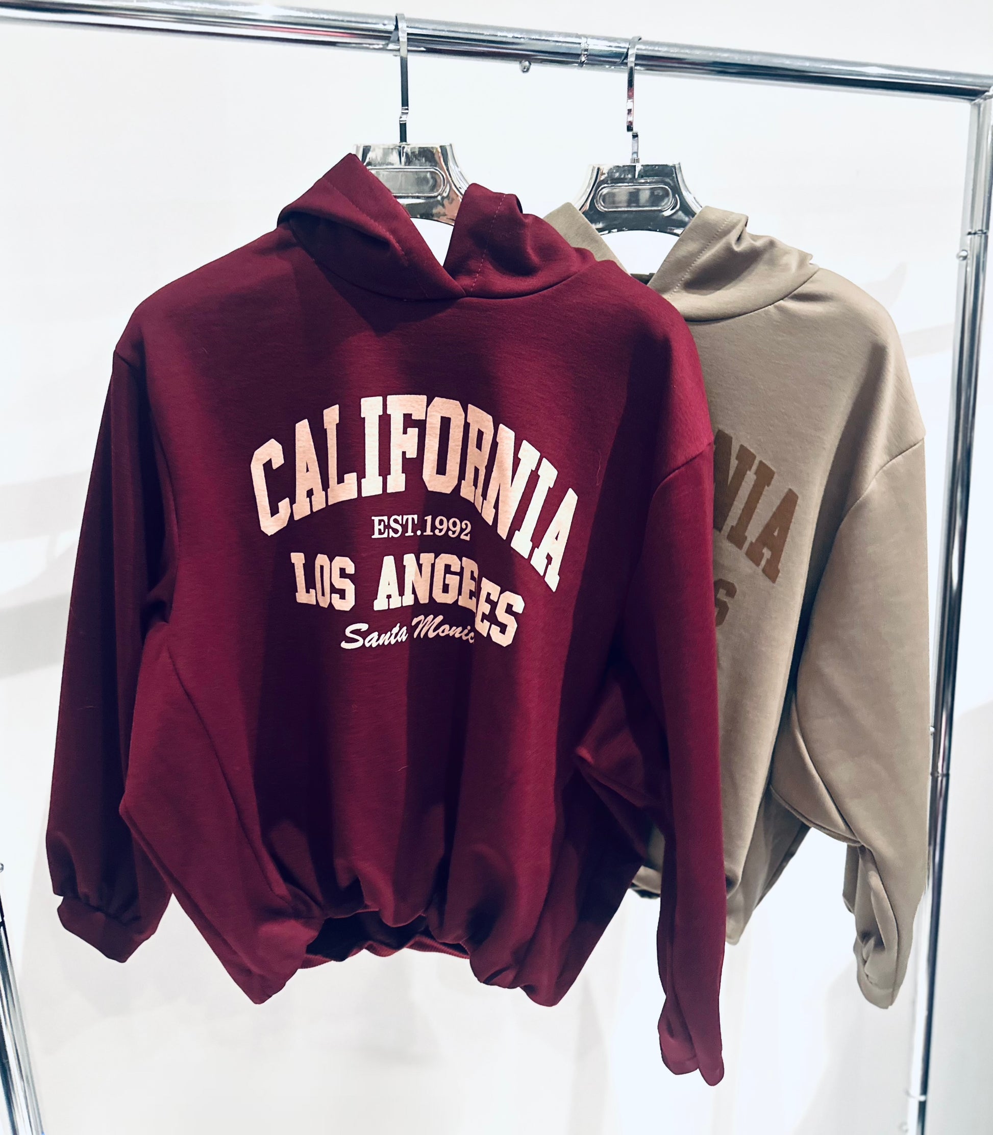 A cosy everyday staple with a clean, effortless look. Designed in a soft neutral tone with statement California Los Angeles slogan detailing to the front, it features a relaxed fit, comfortable hood and a stretch elasticated bottom hem for a flattering, easy-to-wear shape. Perfect for casual days, travel or lounging, and ideal for styling with leggings or denim 🤍✨