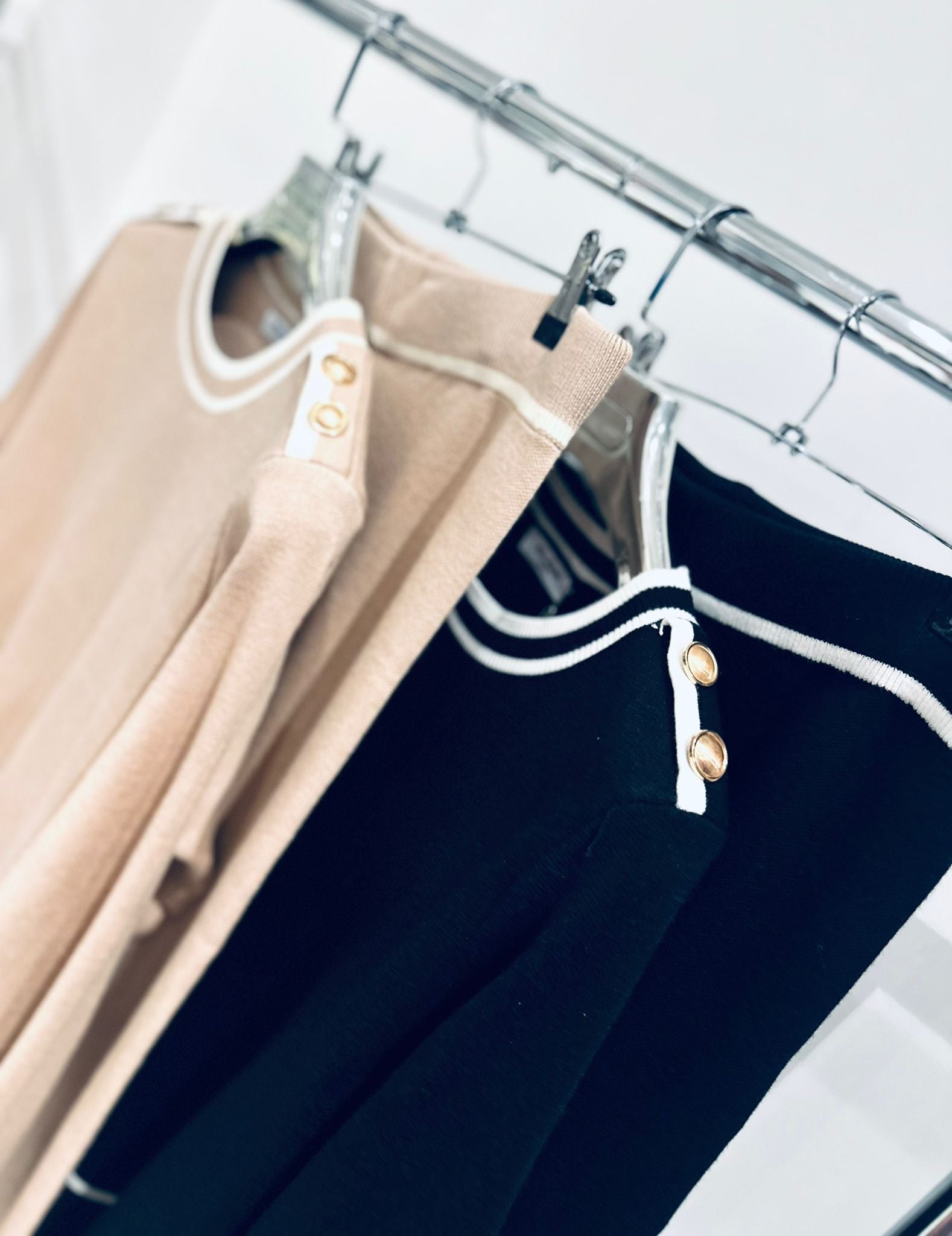 The perfect blend of comfort and effortless style. Featuring a soft, fine-knit top with subtle contrast trim detailing and gold button accents on the shoulders, paired with matching wide-leg trousers for a relaxed yet polished look. Ideal for everyday wear, this co-ord is easy to dress up with boots or keep casual with trainers for a chic, put-together outfit.